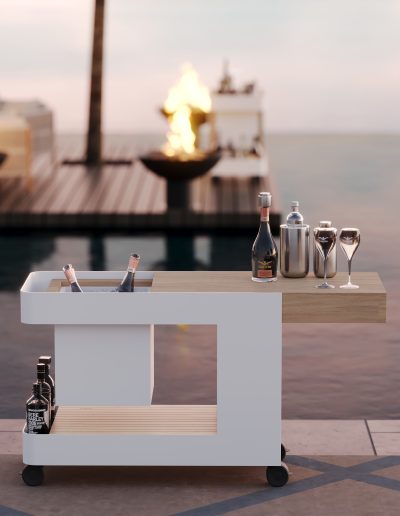 Iceboy TrolleyVotre bar mobile multifonctionnel ‘ICEBOY’ est un bar mobile pouvant aussi servir de meuble d’appoint bien pratique. Ce chariot très stylé gardera vos boissons bien au frais pendant tout l’été. La conception de l’ICEBOY se veut sobre et combine aluminium thermolaqué noir et teck. La glacière avec couvercle garantit une extrême fraîcheur grâce à sa double paroi, mais aussi à son isolation. Vous pouvez utiliser le ICEBOY avec ou sans glaçons. Il suffit d’en remplir complètement la glacière pour qu’elle devienne un seau à champagne géant sur roulettes ! Le plateau supérieur coulissant vous offre un plan de travail royal et fermé, ce bar se transforme en meuble d’appoint bien pratique. Le plateau inférieur se prête non seulement au rangement de verres, mais les bouteilles, en-cas et épices y trouveront eux aussi leur place. Après utilisation, il suffit d’évacuer l’eau contenue dans la glacière grâce à une petite vanne se trouvant en dessous. Infos techniques